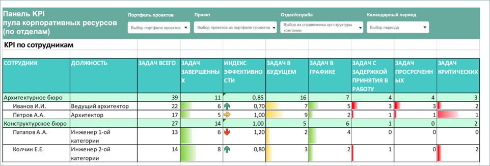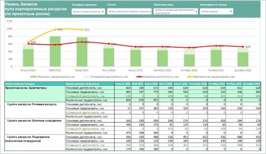 Назначение: План-факт загрузки трудовых ресурсов по портфелю проектов в динамике